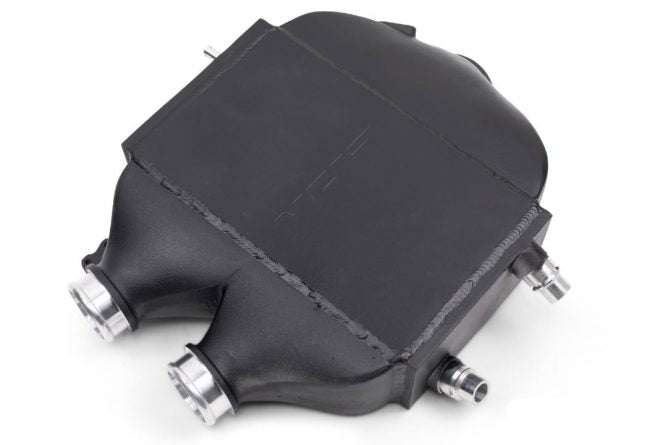 The most important component of any intercooler is the core. The core cools the charged air from the turbo before it enters the engine and the OEM BMW tube and fin intercooler is designed to support low boost levels and air flow. Once boost levels and air flow are increased, the OEM unit is easily overwhelmed and can not keep up with the cooling demands of a tune running more than OEM boost levels. This results in heat soak which will result in a power loss and a higher potential for pre-detonation in the upper RPM range. The OEM intercooler will rise in temperatures up to 105 whereas the VRSF dual pass, high density top mount intercooler will reduce temps down pull which is both harmful for your engine and robs you of power.